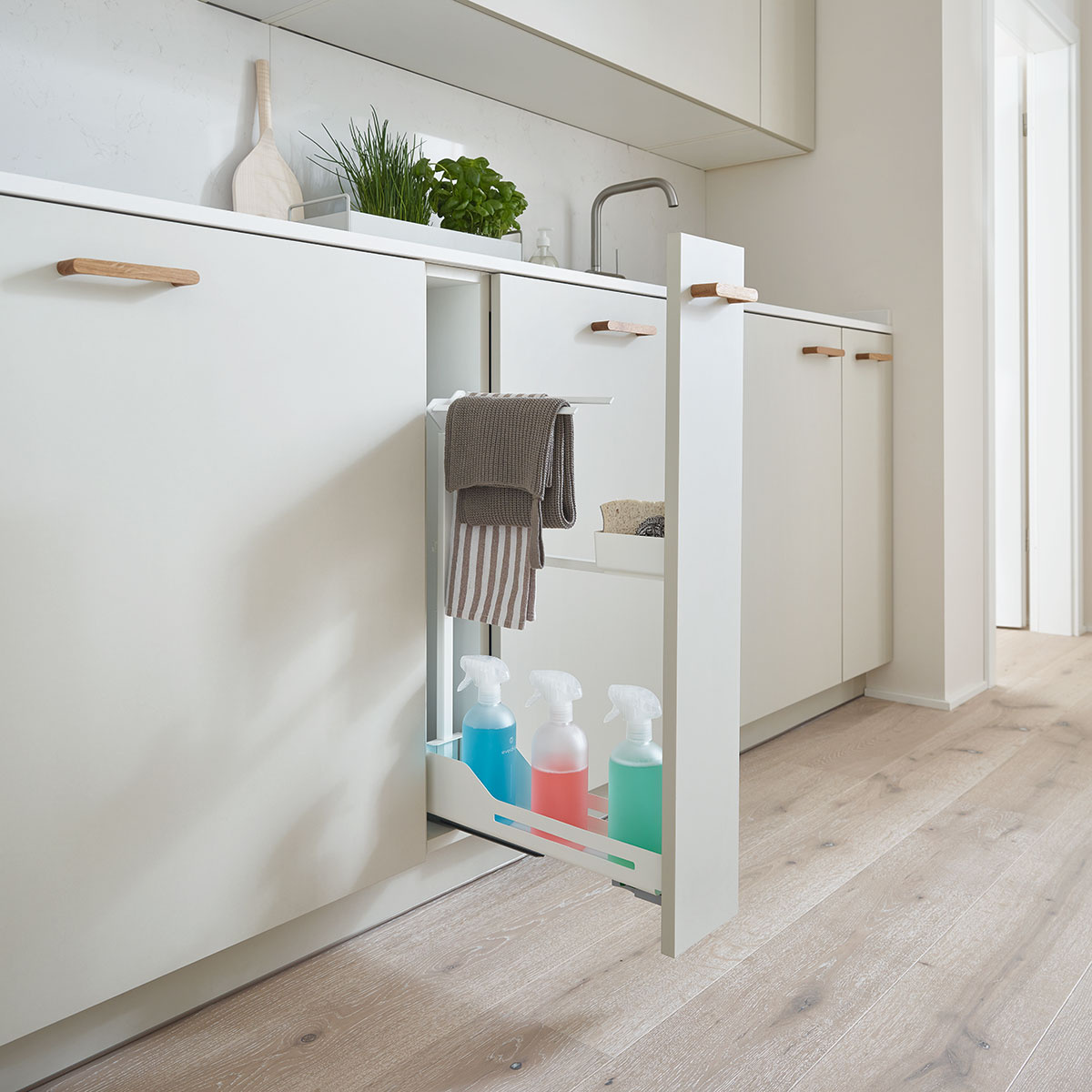 Aprovecha cada rincón de tu cocina con el extraíble para paños Snello, diseñado para muebles bajos estrechos de solo 150 mm de ancho.